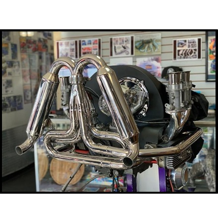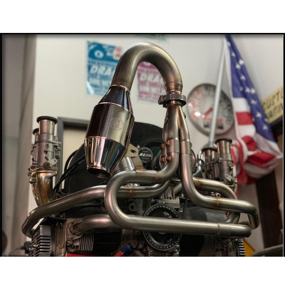 304 grade USA stainless steel buggy header (vertical collector). Hand fitted Tig welded stainless steel merge collector with stainless