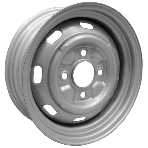 New 4 Lug Silver Wheel with Slots. This wheel fits Late VW bug 4 lug, and accepts OEM Style Hub Caps.