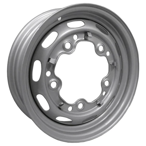 New 5 Lug Silver Wheel with Slots. This Wheel fits Type 1, 1967 & Earlier, Type 2 1967 & Earlier, and accepts OEM Style Hub Caps.