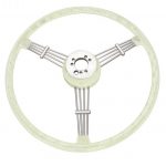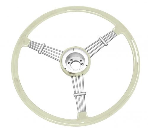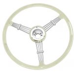 Vintage 3 spoke 15 1/2″ Banjo style steering wheel, available in Black or Silver / Grey. Finger grips are on the under-side. Supplied with horn button. Must purchase a boss kit to complete installation (P/N 79-4062 or 79-4063).