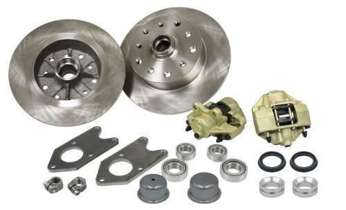 The stopping power and safety of disc brakes in a bolt-on kit. Heavy duty cast brackets bolt directly to your stock style drum spindles and allow the use of 2 piston calipers. The bolt-on disc brake conversion kit will only work with stock, drum brake spindles. Kit includes calipers, pads, mounting brackets, bearings, grease seals,dust caps and hardware.