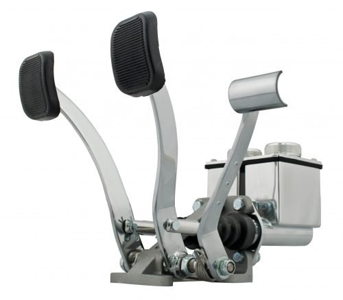 Dual Pedal Assembly Chrome Finished with Aluminum mounting bracket and high square reservoirs with easy fill cap.