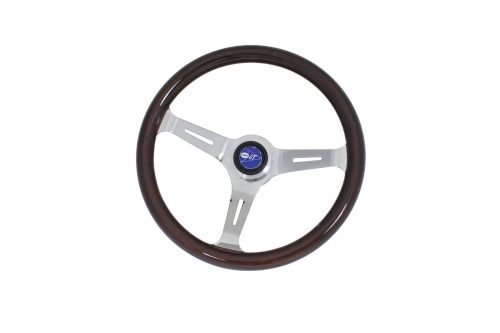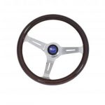 Beautiful Classic Wood with Polished Chrome Spokes. Real Wood Grain finished with finger grips on the under-side. 380mm diameter with Phat 31mm grip or standard 23mm grip. Both feature a 2 1/2″ Dish with Classic 3-Bolt Hub Pattern. Available in light or dark wood. Kits include Polished Billet Aluminum Boss with horn button and 2 logo’s. Kits fit Type 1 & Ghia 60-74 1/2 and Type 3 61-71.