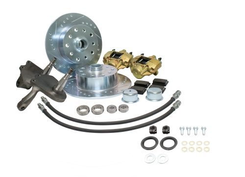Drop your front stance 2.5” and add the benefits of disc brakes all in one package. Kits come with all necessary components including rotors, calipers & pads, wheel bearings & seals and hardware. Kits include brake lines, thrust washers and spindle nuts. Available in 4x130mm with14x1.5mm threads, Double-Drilled 5x130mm with 14×1.5mm threads / 5×4.75” with 12mm threads and Blank (not drilled) for custom wheel applications. Wheel studs are not included. Spindles are offset 1/4″, which widens your track a total of about 5/8”. Must use with 15” wheels.