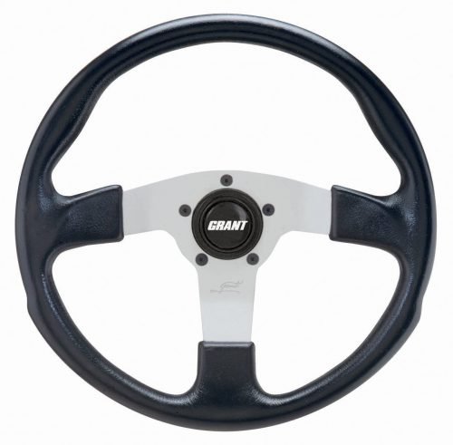 Molded black polyurethane grip with silver or black anodized aluminum spokes with styling sleeve. All of these steering wheels have a 5-hole flange, but each kit is supplied with the adapter to take this wheel to a 3-bolt mounting.