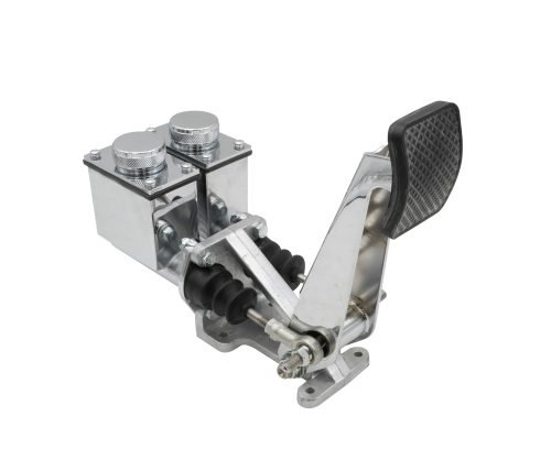 Single Pedal Assembly with Dual Master Cylinders with built-in balance bar, or Single Master Cylinder. Chrome Finished with Aluminum mounting bracket and high square reservoirs with easy fill cap.