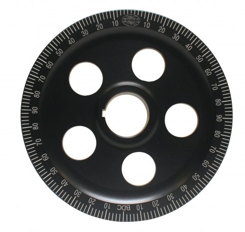 The Ultimate Aluminum Degree Pulleys. Hard anodized black for maximum durability plus Laser Engraved degree numbers and marks. Available in standard grooved, bolt-in and machined case sand seal versions. Stainless steel collar installed in the pulley’s seal area. (Note: P/N 9118: Long Bolt Kit must be used with Bolt-In Sand Seal Pulleys).