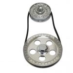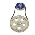 Kit includes our 5 Hole Design Crank Pulley with Chrome Bolt and Washer, Chrome Alternator / Generator Pulley, Finned Acrylic Cover in blue, Chrome Generator Nut and Spacer and Belt. Kits come complete with matching color screened onto the crank pulley.